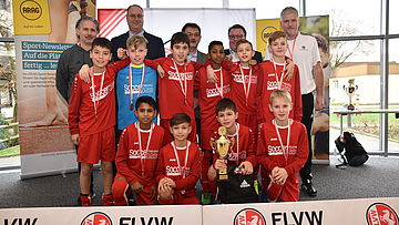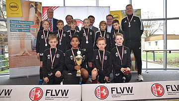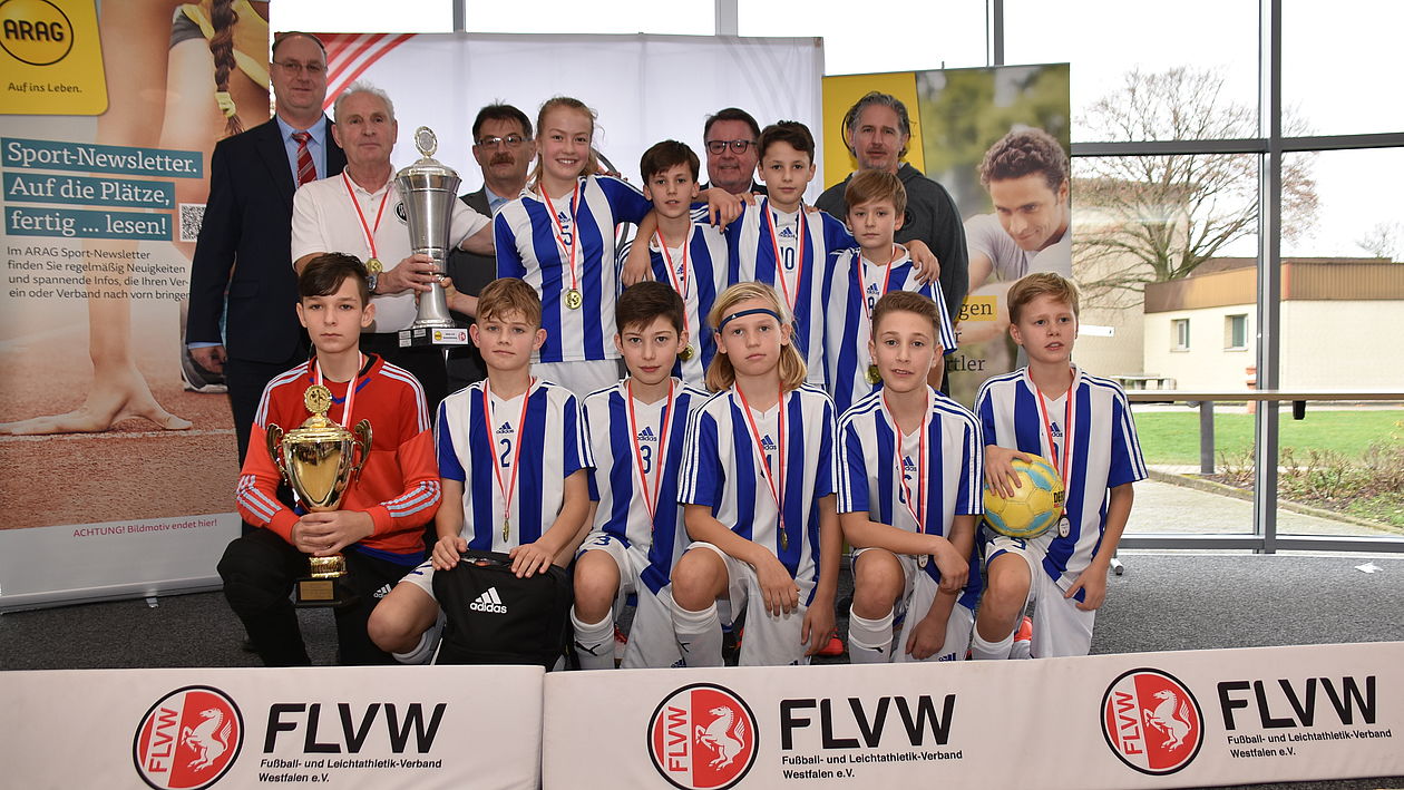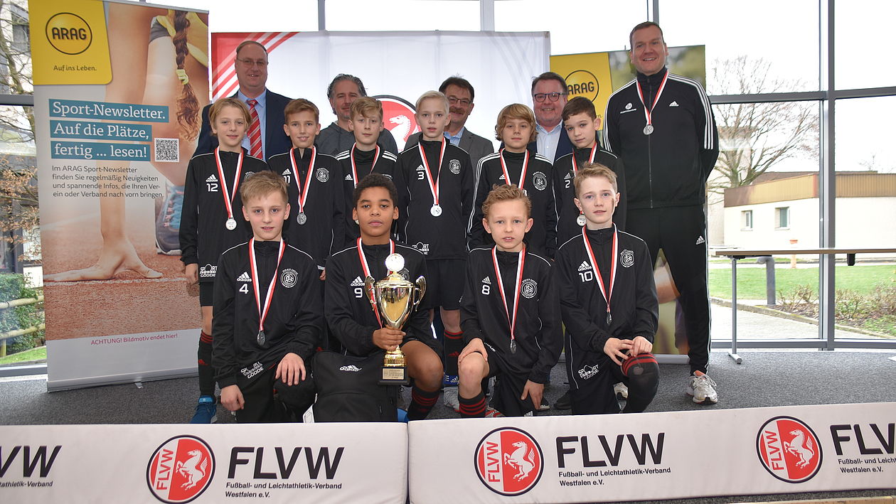 Die Siegerehrung wurde in Teamarbeit durchgeführt: Andreas Berg vom Turnier-Sponsor ARAG, FLVW-Vizepräsident Jugend Holger Bellinghoff, Harald Ollech, Vorsitzender des Verbands-Jugend-Ausschusses und der für den Jahrgang zuständige Verbandsfußballlehrer Tobias Zölle ehrten die siegreichen Teams.
